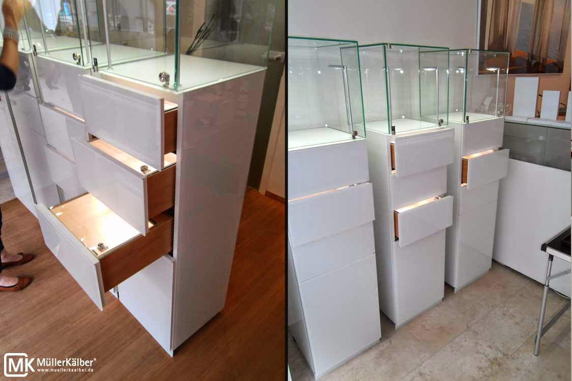 Mit und für Frau Schäfer wurde die MK 600 mit Schüben entwickelt. Im Sockel befinden sich 3 Schubladen sowie ein Stauraum, die Schubladen lassen sich von den Kunden öffnen, hier können weitere Schmuckstücke betrachtet werden, die sicher hinter einer abschließbaren Glasscheibe liegen. Jede Schublade ist ausserdem auch beleuchtet. Der Sockel ist mit hinterlackiertem Glas belegt.