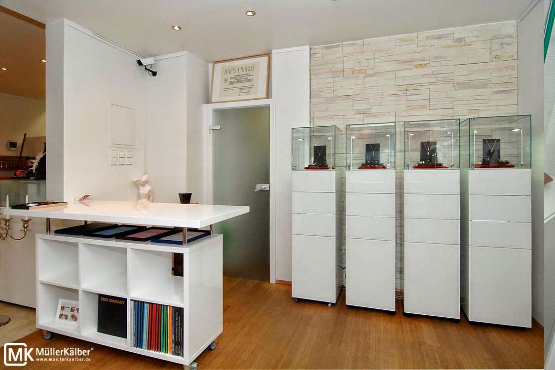 Gute Projekte brauchen manchmal eine wohlüberlegte Planungsphase. Mit Frau Schäfer vom Goldschmiedeatelier Marion Schäfer führten wir jahrelang nette Gespräche auf der Inhorgenta, bis sich ihr 2010 die Gelegenheit bot, das Ladengeschäft zu erweitern, als der Nachbar auszog. Die Wand zwischen beiden Ladenlokalen wurde herausgetrennt.