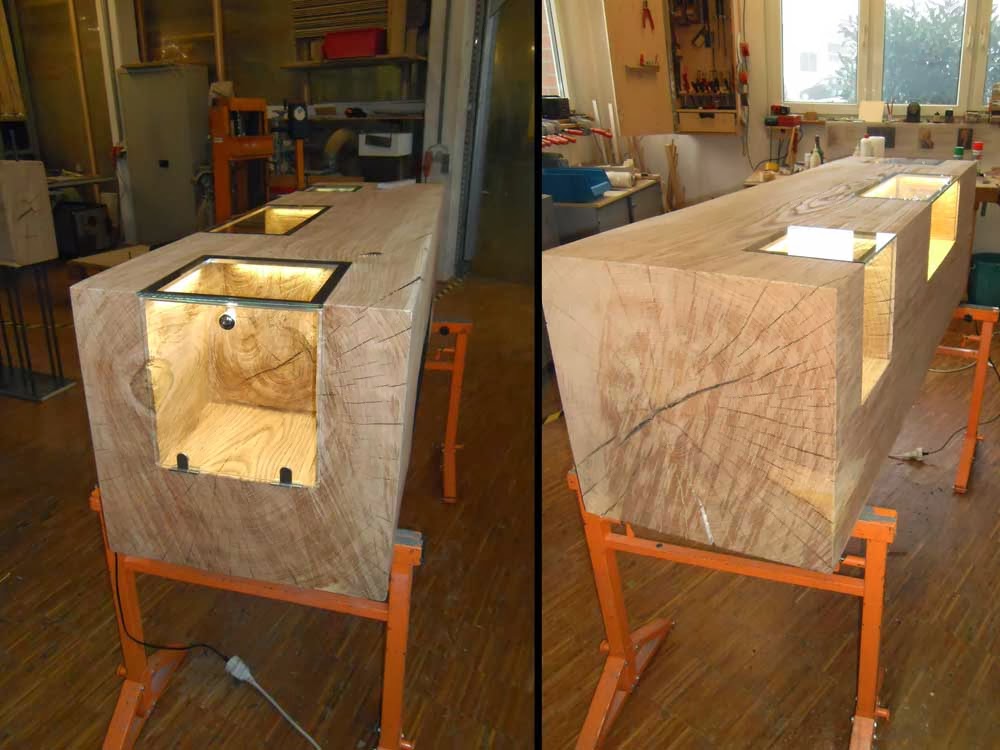 Hier zu sehen die Theke aus massiver Eiche, mit eingestemmten Aussparungen. Die Aussparungen werden ebenfalls mit LED Stripes beleuchtet, die nötige Sicherung bietet der Glasdeckel sowie die Glastür. Der Fuss wird gesondert transportiert, da die Theke an einer Stelle im Laden stehen soll, an der eine Stufe ist.