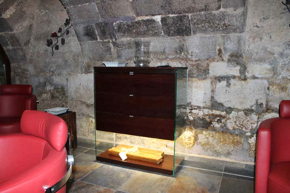 Das Restaurant Lamm in Großaspach wurde 2011 umfangreich saniert. Eine Raucherlounge mit abgetrenntem Weinkeller wurde in den Gewölbekeller gewünscht. Ende 2011 installierten wir die Glastrennwand mit integrierter Vitrine. Ebenfalls geliefert wurden ein Lesepult, ein Sideboard, ein Medienboard und ein Gläserschrank. Alle freistehenden Möbel wurden in ähnlichern Bauart für das Lamm entworfen: die Wangen aus Glas tragen das Korpuselement.