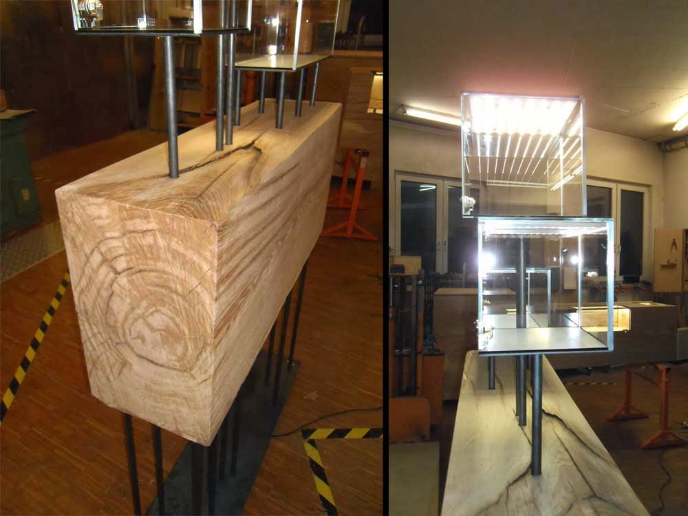 Der Eicheblock im Schaufenster steht auf Füssen aus Schwarzstahl, die Vitrinenwürfel in unterschiedlichen Grössen werden getragen von weiteren Schwarzstahlfüssen.