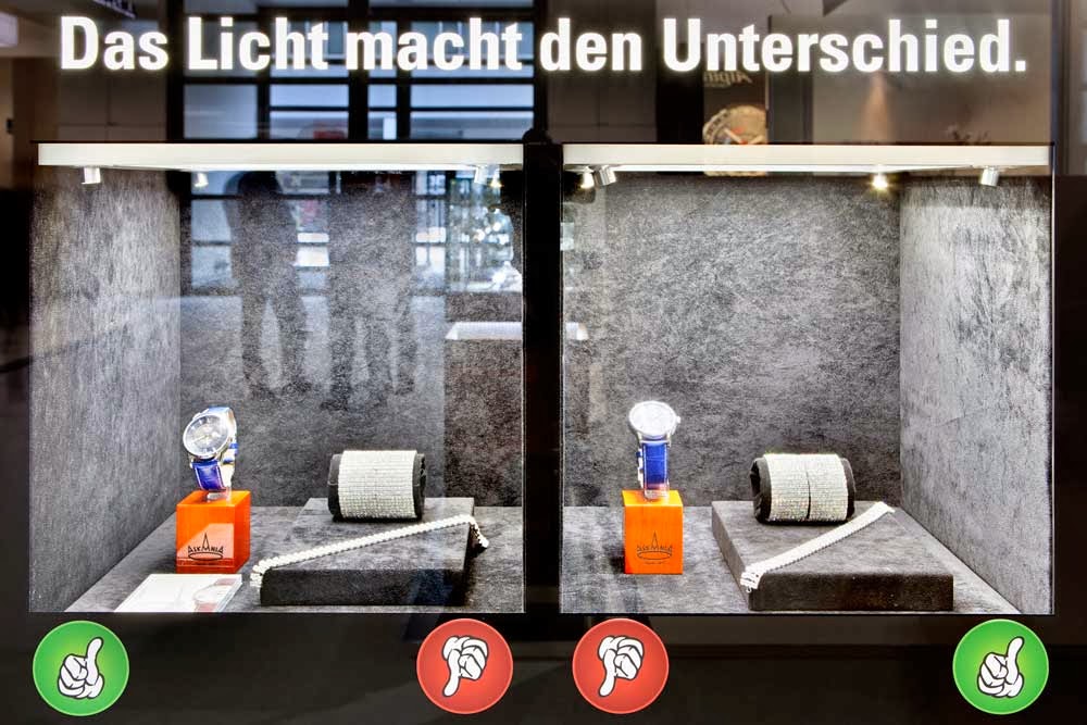 Diese Woche beschäftigte uns die Beleuchtung dieses Glaswürfels, welcher nur 20 x 20 x 20 cm ist. Unser reguläres Aluminiumprofil war einfach zu wuchtig für die kleine Vitrine, die in einen Laden in London im mehrfacher Ausführung geliefert wird. Wir haben letztendlich ein kleineres Kühlprofil gefunden, welches eine filigrane Beleuchtung ergibt. Auch die Stromzufuhr war zu wuchtig im Innenraum der Vitrine, also haben wir den Strom in der hinteren Glaskante hochgeführt.